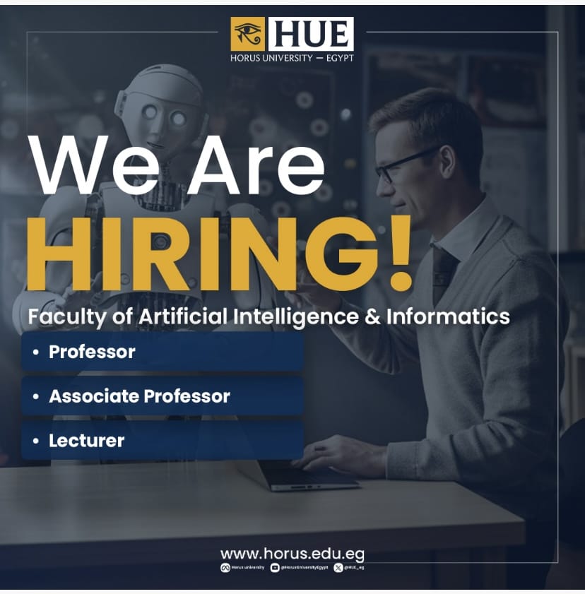 تعلن كلية الذكاء الاصطناعي و المعلومات بجامعة حورس-مصر عن فتح باب التقدم (تعيين- ندب كلي) لوظائف أعضاء هيئة التدريس من الحاصلين على درجة الدكتوراه (أستاذ -أستاذ مساعد - مدرس)