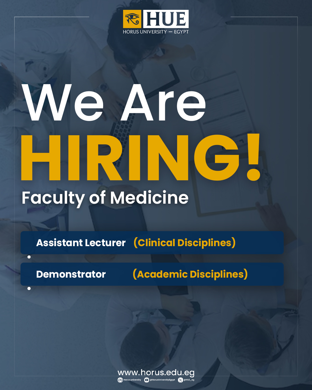 تعلن كلية الطب البشري بجامعة حورس- مصر عن فتح باب التقدم لشغل وظائف أعضاء هيئة التدريس المعاونة ( مدرس مساعد - معيد )
