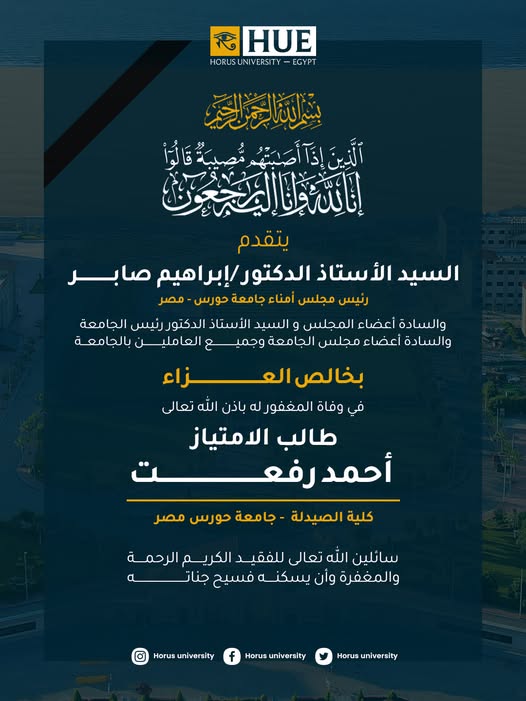 تتشرف جامعة حورس – مصر بخالص التهنئة للسيد الأستاذ الدكتور/ محمد أحمد ضبعون بمناسبة توليه منصب نائب رئيس الجامعة لشؤون التعليم والطلاب