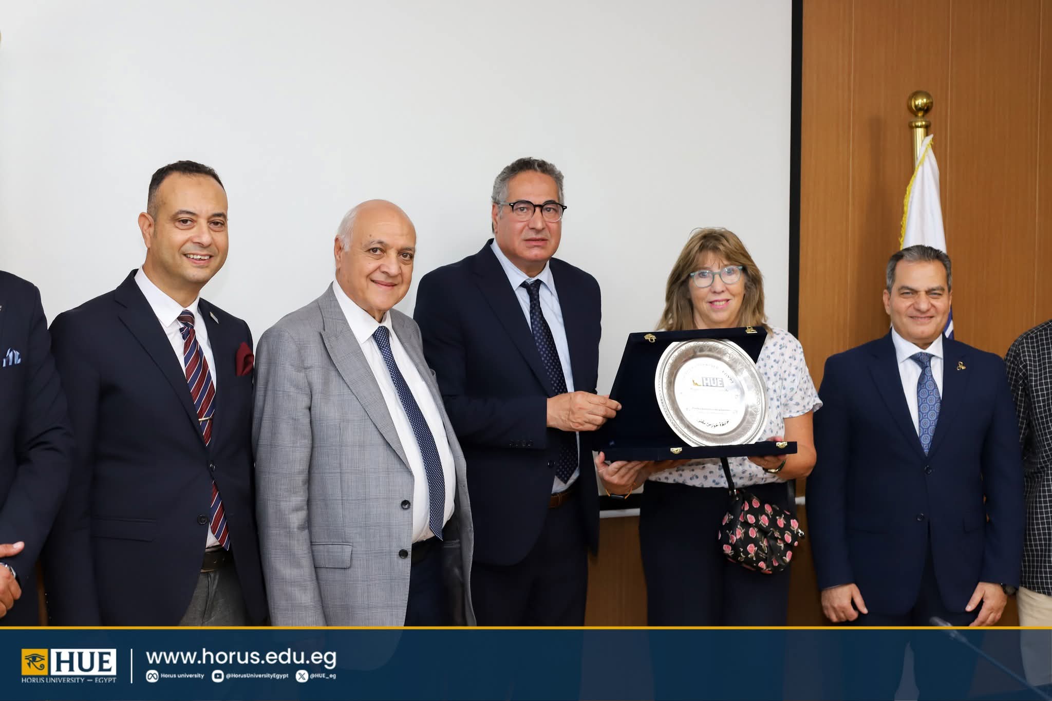 During the meeting, Prof. Dr. Hefferon was honored and presented with the Horus University Shield in appreciation of her efforts to strengthen academic and scientific collaboration between the two institutions.